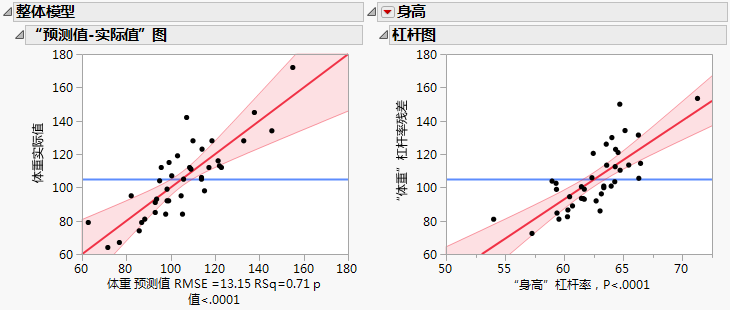 整体模型“预测值-实际值”图以及针对身高的效应“杠杆图”显示在图 3.58中。左侧的整体模型图针对所有效应进行检验。您可以推断出该模型显著,因为置信曲线跨越响应体重均值处的水平线。右侧的身高“杠杆图”也显示身高是显著的,即便是模型中包含年龄和性别也是如此。这两个图均未表明需要担心与影响点或多重共线性相关的问题。