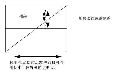 之所以使用杠杆率一词,是因为这些图可帮助您直观演示在模型中添加效应后各点对检验的影响。在水平方向距离图中心较远的点与接近中心的点相比,对效应检验发挥的影响更大。回想一下,效应检验涉及比较模型在包含和不含该效应时的残差平方和。在极值处,受假设约束之前和之后的残差的差值相对较大。因此,这些残差往往对该效应的假设检验的平方和有更大的贡献。