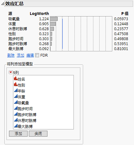 显示每个模型效应的假发现率 LogWorth,该值定义为 -log10(FDR P 值)。这是用于标绘和评估显著性的最佳统计量。不过,该统计量高度依赖于显著性排序,对于正相关检验很保守,并且不提供 alpha 水平下实验方面的保护。选中 FDR 复选框可将 LogWorth 列替换为 FDR LogWorth 列。