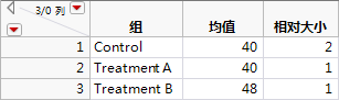 相对大小列显示所需的治疗组相对大小。该列指示控制组需为每个治疗组的两倍大。(或者,您可以根据相对大小准则,为治疗组最初猜想一个大小。)