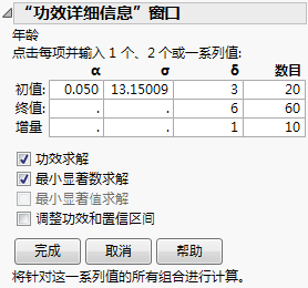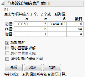 本例使用 Big Class.jmp 样本数据表演示了回顾功效分析。“功效详细信息”窗口(图 3.70)允许在 α、σ、δ 和“数目”或研究大小的范围内探索各种量。点击“完成”,该窗口将替换为计算结果。