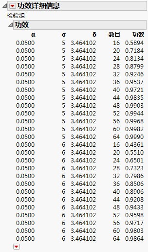 图 3.75所示的“功效详细信息”报表取代“功效详细信息”窗口。该报表针对 α = 0.05,σ = 5 和 6 的所有组合,以及以 4 为增量从 16 到 64 的样本大小提供功效计算。σ 为 5 时,要获取大约 90% 的功效,您需要总样本大小大约为 32。您需要控制组中有 16 个参与者,每个治疗组中有 8 个参与者。另一方面,若 σ 为 6,则总共需要 44 个参与者。