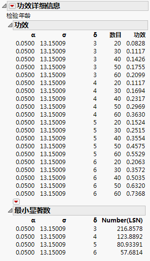 最小显著数 (LSN) 是在指定了 delta、sigma 和 alpha 值的前提下,得到显著检验结果的最小观测数。回想一下,delta、sigma 和 alpha 分别代表效应大小、误差标准差和显著性水平。
