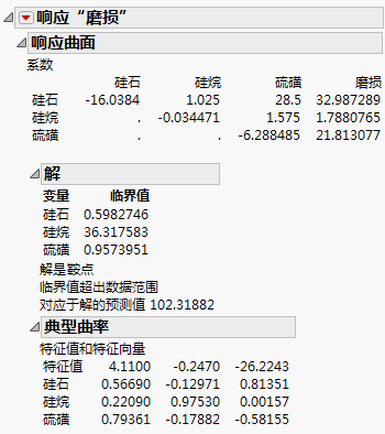 “系数”表显示为“响应曲面”报表的第一个部分,该表提供估计模型参数的简要汇总。前面几列提供二阶项的系数。最后一列提供线性项的系数。要查看完整的预测表达式,请从该报表的红色小三角菜单中选择估计值 > 显示预测表达式。