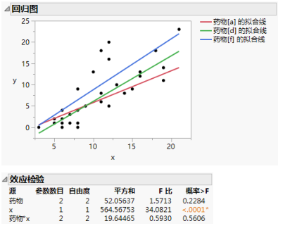 图 4.6显示了该报表的一部分。“回归图”显示具有不同斜率的拟合线。“效应检验”报表给出交互作用的 p 值为 0.56。该值并不显著,这指示该模型不需要包含不同斜率。
