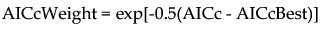“AICc 最佳”是拟合模型中最小的 AICc 值。然后按降序对 AICc 权重排序。累积小于 1 减去总 AICc 权重截止值的 AICc 权重设置为零,使得很弱的项具有真实的零系数而非很小的系数估计值。