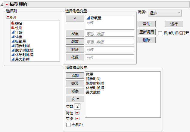 Fitness.jmp 数据表包含一个有氧健身研究的结果。可以使用特殊的测试来评估有氧健身的效果,该测试对在跑步机上跑完规定距离的人员测量吸氧量。但是若能找到一个使用更简单的测量方法来评估健身效果和预测吸氧量,那就更为经济实惠。为了确定这样的方程,我们对跑了 1.5 英里的 31 名参与者进行了测量,记录了他们的年龄、体重、跑步时间和脉搏。