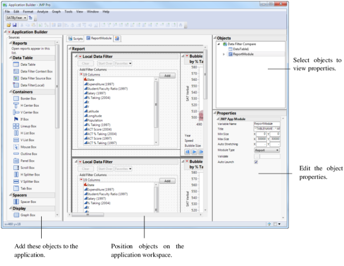 The Sources pane shows objects that you can include in the application, including open reports and graphs. Right-click an object and select Scripting Help for information about the object and its properties.