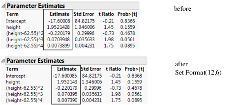 The first argument to Set Format sets the column width by the number of characters to display. The second argument sets how many decimal places are shown in the table.