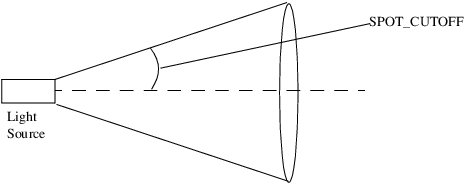 To create a spotlight, limit the shape of the light to a cone. Use the SPOT_CUTOFF argument to define the side of the cone, as shown in the following illustration.