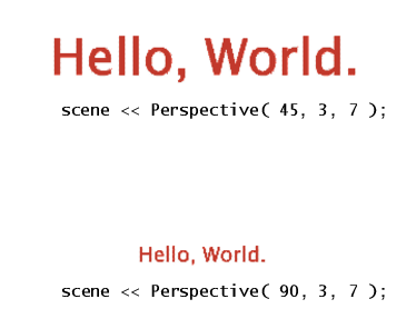 The viewing angle functions in the same way as a wide angle or telephoto lens on a camera. Small viewing angles zoom into a drawing, while wide angles zoom out. In other words, a small viewing angle maps the screen space onto a small portion of the scene, resulting in apparently larger scene elements. A large viewing angle maps the screen space onto a large portion of the scene, resulting in apparently small screen elements. The size of scene elements can therefore be manipulated using the angle argument of the Perspective function. The picture here shows the hello world script with perspective angles of 45 and 90 degrees.