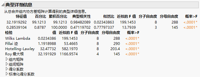 列出针对在各组上协变量的均值相等这个原假设的四个标准检验:Wilk Lambda、Pillai 迹、Hotelling-Lawley 和 Roy 最大根。请参见多元检验和判别分析附录中第 近似 F 检验。