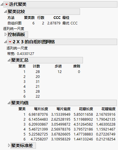 “聚类比较报表”显示聚类总数以及请求的行数。SOM 报表根据请求的网格大小进行命名。“带宽”在“SOM 网格”报表的顶部给出。该报表本身类似于“K 均值聚类数”报表。请参见