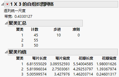 本例使用 iris.jmp 样本数据表,其中包括三种鸢尾花的萼片长度、萼片宽度、花瓣长度和花瓣宽度的测量值。