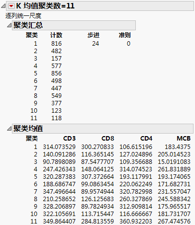 在本例中,您使用 Cytometry.jmp 样本数据表通过“K 均值聚类”对观测进行聚类。血细胞计数用于检测细胞表面的标记,这些标记的读数有助于诊断某些疾病。在本例中,基于血细胞计数分析中四种标记的读数来对观测进行分组。