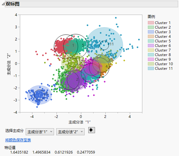 标识聚类颜色的图例显示在图的右侧。基于聚类前两个主成分,聚类 3、10 和 11 显示为与其他聚类分的最开。图 12.4中这几个聚类的平行坐标图支持该结论,它们与其他聚类的图有所不同。使用该图下面的列表可查看其他主成分组合的双标图。