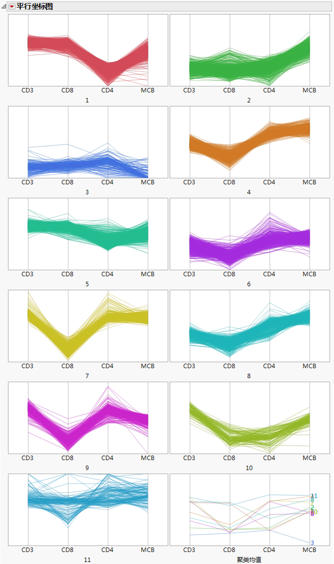 “平行坐标图”显示每个聚类中观测的结构。使用这些图可查看聚类有哪些不同。聚类 4、6、7、8 和 9 往往有相对低的 CD8 值和高的 CD4 值。另一方面,聚类 1 有更高的 CD8 值和更低的 CD4 值。