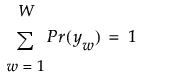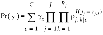 J 个变量的多维列联表包含 W = R1*...*RJ 个单元格。其中的每一个单元格依据其针对 J 个变量的响应模式来定义。因此,每个响应模式是形式为 y = y1, ..., yj 的 J-长度向量。将 Y 定义为所有响应模式视为行向量的 J x W 数组。Y 中的每个元素 yw, 都具有概率 Pr(yw)。这些概率之和为 1: