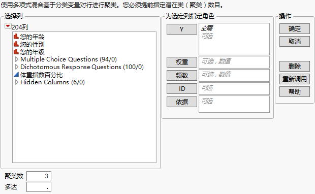 您要分析的一个或多个列。您可以分析建模类型为名义型、有序型或多重响应的列。要分析名义型或有序型响应,需要两列或更多列。若包含多重响应并且建模类型为多重响应,则只需一列。