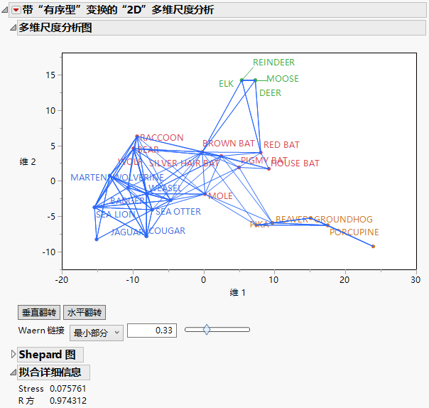 通过将实际邻近性与预测邻近性加以比较,Waern 链接提供对 MDS 结果的可视检查。这些链接基于“多维尺度化图”上各点的实际邻近性连接各点。具有最小(最大)邻近性的对象将连接起来。可以考虑的典型方案是对象之间最小 33% 的邻近性。若 MDS 图能很好地表示邻近性,则针对最小实际邻近性的链接应连接图中最靠近的对象。若针对较小邻近性的链接在图中延伸,以至于连接了相距较远的对象,则需要质疑 MDS 拟合。