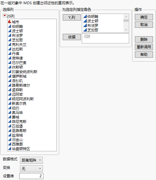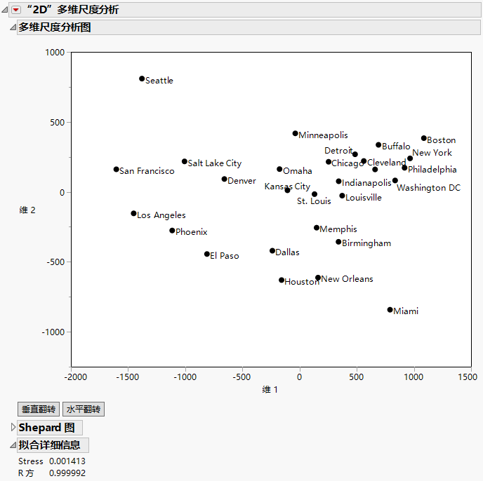 本例使用 Flight Distances.jmp 样本数据表,该表是美国 28 个城市之间的飞行距离的距离矩阵。您可以基于数据表中两两城市间的距离使用 MDS 构造二维城市地图。
