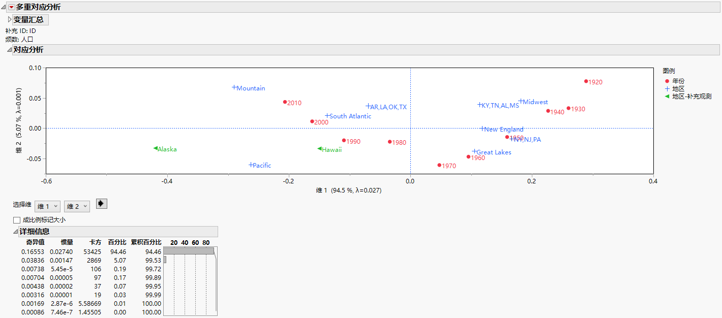 美国人口普查可用于查看上个世纪的人口增长率。US Regional Population.jmp 样本数据表包含 1920 到 2010 年间每个人口普查年份的美国 50 个州的人口数,50 个州按地区进行了分组。阿拉斯加州和夏威夷州被视为补充地区,因为在整个普查期间它们还没建州,而且不与美国大陆接壤。您想关注这两个州的人口增长率是否不同于美国其他州的人口增长率。