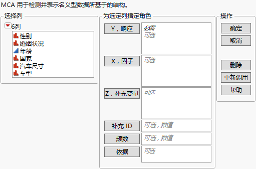 指定要分析的分类列。在 MCA 中,您通常关注变量之间的关联,但是没有明确的“解释”和“响应”变量。