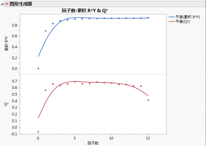累积 R2Y 随因子数的增加而增大。这是因为随着因子添加至模型,更多的变异得到解释。