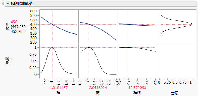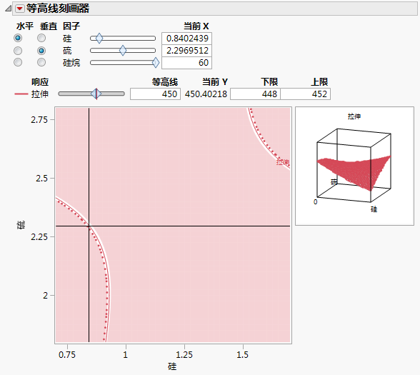 红色的实曲线上的值是预测拉伸值将为 450 时的硅石和硫磺值。未着色带内的值预测拉伸值介于 448 和 452 之间。您可以将图上显示的十字准线拖到未着色部分来查找硅石和硫磺的特定设置。图 4.8中显示了一个这样的设置。