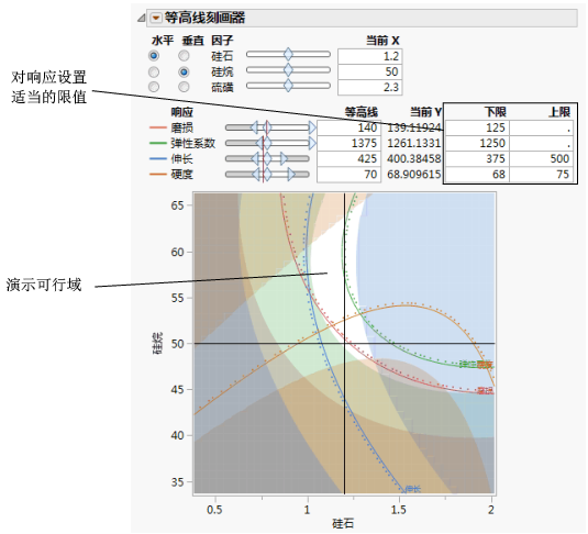 若您指定响应列的限值,则为可行域之外的图区域着色。未着色的白色区域表示可行域。请参见
