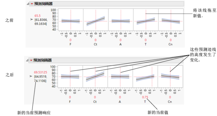若更改某个因子的值,该因子的预测迹线不受影响,但所有其他因子的预测迹线可能更改。Y 响应线必须穿过预测迹线与其当前值线的交点。