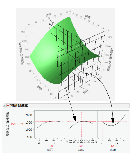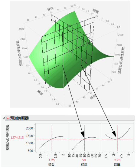 在下面使用 Tiretread.jmp 的示例中,观察弹性系数(作为硫磺和硅烷的函数,硅石保持不变)表达式的响应曲面。现在观察网格如何在硫磺值为 2.25 处横切硅烷。注意切片如何与曲面相交。若转换到下图,这将成为硅烷的刻画线。同样,请注意网格在硅烷值为 50 处横切硫磺。相交部分向下转换到硫磺图形上即为硫磺的刻画线。