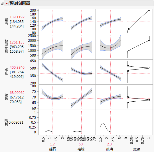 数据位于 sample data 文件夹的 Tiretread.jmp 表中。使用该数据表中的“4 种响应的响应曲面设计”脚本,该脚本为这 4 个响应定义具有完全平方响应曲面的模型。将为所有响应都显示汇总表和效应信息,后面紧随图 3.18中所示的预测刻画器。意愿函数如下所示:
