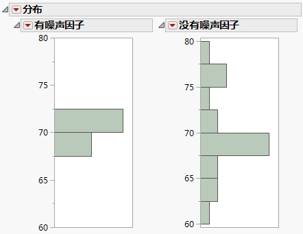 这些直方图显示:当噪声因子未包含在分析中时,硬度的变异更大。