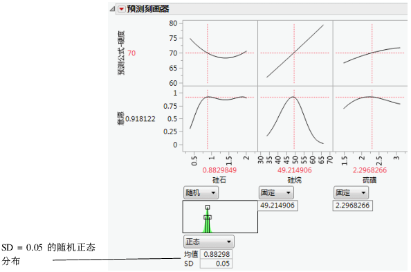 例如,使用 Tiretread.jmp 样本数据集。该数据集显示轮胎制造商的实验结果,实验目标是基于硅石、硅烷和硫磺三个因子的含量来匹配硬度目标值 = 70。假定硅烷和硫磺含量可以方便(精确)地进行控制,但是硅石则存在需要考虑的变异性。