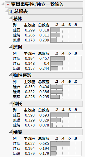 报表中为这四个响应均显示了对应的表。“总体”表显示了不同响应的因子重要性指标的平均值。“预测刻画器”中的因子(图 3.29)已经过重新排序,符合其在“总体”表的“总效应”重要性中的顺序。