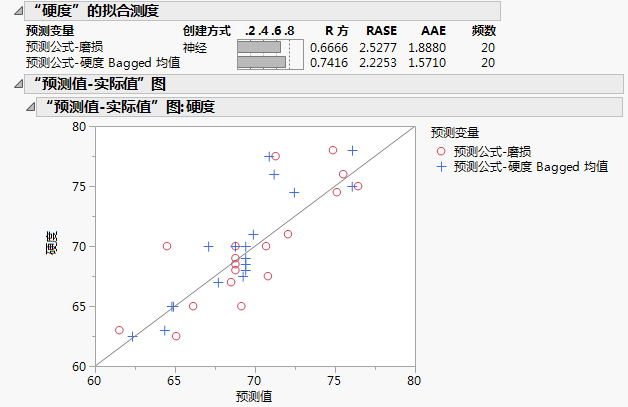 该示例比较了磨损的预测。要比较其他响应变量的预测,请按照第 2 步到第 6 步执行,将磨损替换为所需的响应变量。作为另一示例,图 3.33显示硬度的“拟合测度”报表。该报表显示的结果与磨损的“拟合测度”报表结果相似。Bagged 预测的 R 方值略高于原始模型预测的 R 方值,这说明拟合效果更好,预测得到改进。