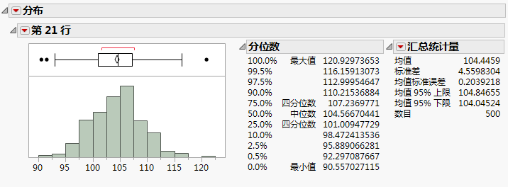 图 3.35中的“分布”报表包含有关每个 Bagged 模型的磨损预测值的分布信息。新观测的磨损最终预测值是 104.45,它是所有 M 个 Bagged 预测的均值。该预测的标准误差为 4.56。您还使用分位数创建新预测的置信区间。例如,新预测的 95% 置信区间为 95.89 到 113.00。