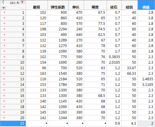 您现在有数据表中每个观测的磨损预测以及这些预测的标准误差。假定您有一个观测,对应硅石、硅烷和硫磺的新值分别为 0.9、43 和 2。您可以预测磨损响应并获得该预测的置信区间,因为“保存预测公式”选项保存每个 Bagged 模型的回归方程。因此,使用新因子值生成 M 个预测,以创建可能的预测分布。该均值是最终预测,但是分析分布可以告诉您预测的准确度。