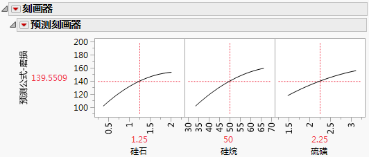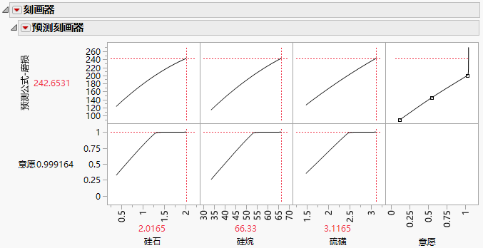 本例使用 Tiretread.jmp 样本数据表。共有三个因子(硅石、硅烷和硫磺)和四个响应(磨损、弹性系数、伸长和硬度)。目标是在开发轮胎胎面化合物时找到三个因子的最佳组合。请参见 Derringer and Suich (1980)。