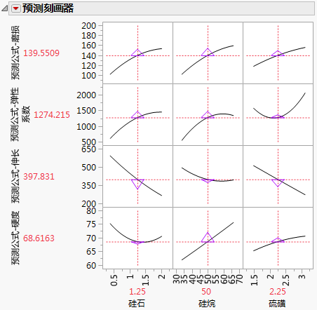 显示或隐藏交互作用图,当您在“预测刻画器”中更新因子值时这些图随之更新。使用该选项通过观察当因子的当前值更改时图形如何变化,来帮助可视化三次交互作用。随给定因子更改的单元格是未直接涉及该因子的单元格。