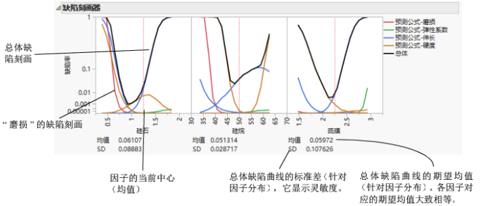 “缺陷刻画器”显示缺陷率作为固定在指定均值处的每个因子的函数,而所有其他因子则根据它们的随机规格进行变化。若有多个带有规格限的输出,则每个输出都有不同的带颜色编码的缺陷率曲线。黑色曲线显示总缺陷率。
