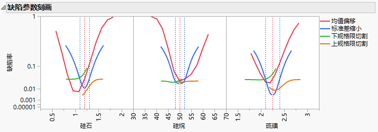 “缺陷参数刻画器”报表显示过程更改对缺陷率的影响。这些影响基于每个因子的模拟参数设置。考虑四种场景。