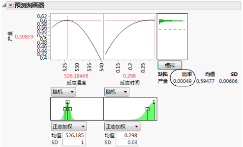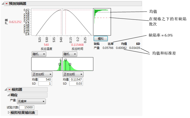 对于“反应温度”540 和“反应时间”0.115,预测的产量为 0.62。在假定温度和时间存在变异的条件下,模拟估计的平均缺陷率约为 6%,标准差为 0.03。缺陷率 6.0% 指示约有 6.0% 的批次将超出规格。