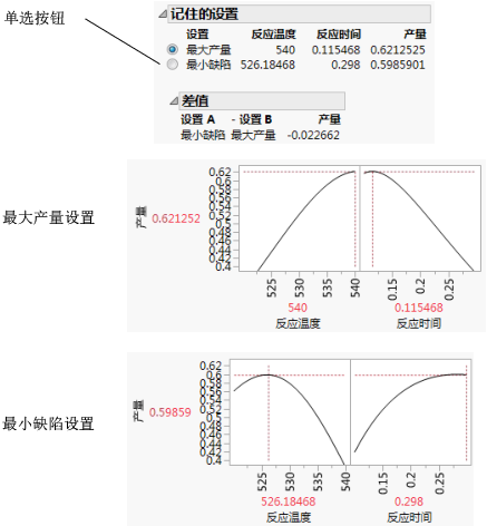 通过对输入因子设置稍作更改,缺陷率降至大约 1.8%,预测产量降低不足 0.01。使产量最大化的固定(无变异性)设置与存在因子变异时缺陷率最小化的设置不同。