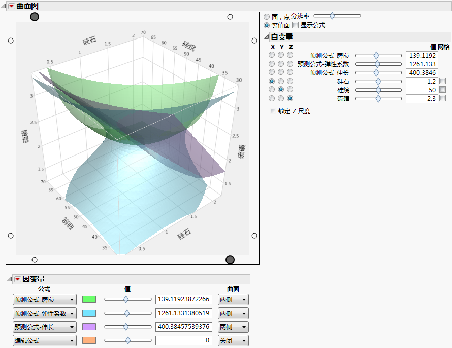 等值面是等价于二维等高线图的三维图。等值面要求公式具有三个自变量。“分辨率”滑块确定计算公式所用各点的 n × n × n 立方体。“因变量”部分中的“值”滑块用于选择等值面(即等高线水平)值。