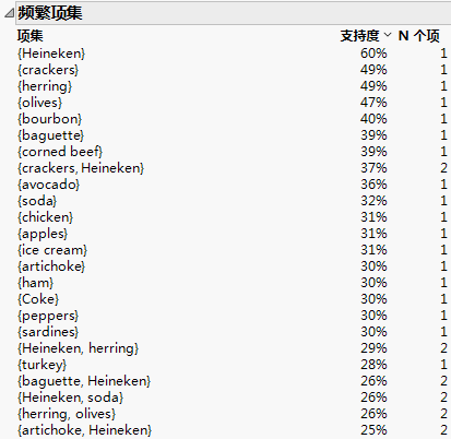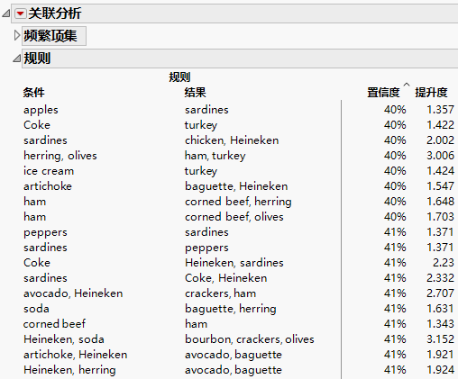 “频繁项集”报表显示 36% 的客户购买了鳄梨。图 21.2 中的“规则”报表显示这些客户中有 58% 的客户也购买了洋蓟。由于较大一部分客户都存在该行为,杂货店管理人员可以使用该信息战略性地对鳄梨和洋蓟进行位置摆放。