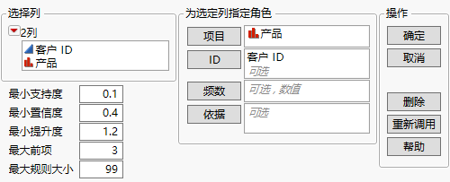 您可以在启动窗口中使用最小支持度、最大前项和最大规则大小等选项来减少大型数据集的计算时间。有关这些测度的详细信息,请参见
