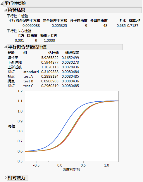 “检验平行性”选项提供的分析用于检验不同的组之间拟合模型是否具有相同的形状,但拟合线会沿着 X 轴平移(图 12.9)。在 Bioassay 示例中,药物配方 B 的曲线平移到其他三条曲线的左侧。不过,您并不知道这些曲线是仍具有相同形状(平行),还是配方 B 具有不同的形状。“平行性检验”告诉我们不同的药物配方是否具有相似的形状,以及是否只是沿着水平轴的平移。从拟合模型的红色小三角菜单中选择检验平行性可以添加该报表。
