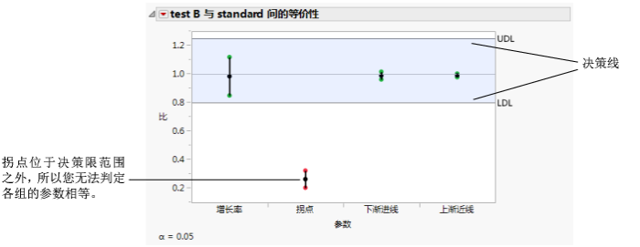 若所有置信区间都位于决策线的范围内,则两组模型实际上是相等的。若有一个区间落在决策线的范围之外(如图 12.12所示),则无法判定两组模型相等。药物配方 B 比标准配方的拐点低,这与之前的研究结果一致。